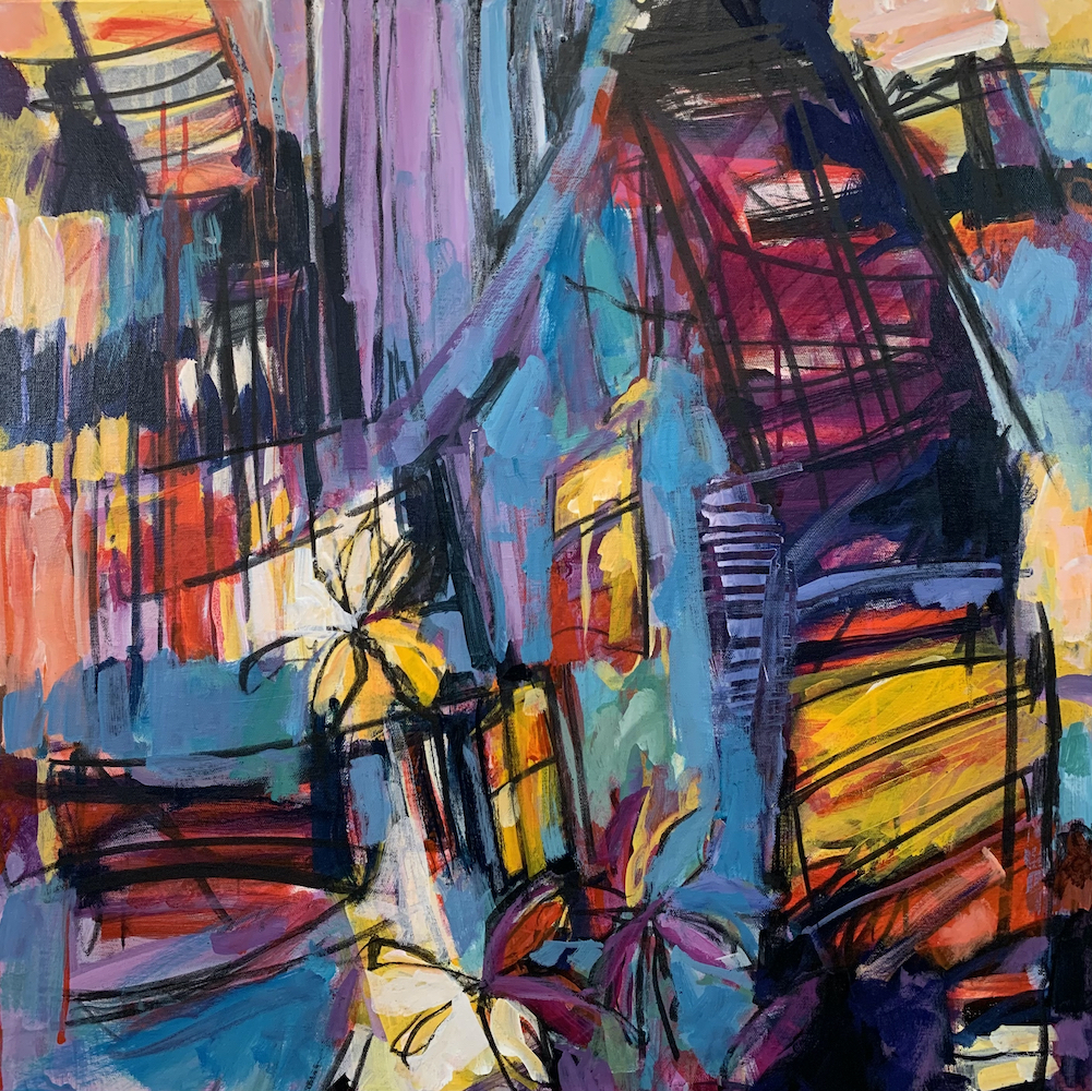 Over time, I’ve discovered that the more I create, the more intuitively I work. I build paintings in layers. They move and shift as they progress. Though I left my former life as a graphic designer behind, I still crave strong compositions, bold shapes, and charged color relationships.