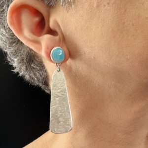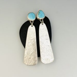 Artist Notes: These earrings match the turquoise ring and will go well with any of the other pieces in my Divine Collection. The turquoise is a natural blue and the textured form dangling from each stone is fine silver as are the settings. Large earring backs are provided to support the earrings so they do not fall forward. They hang about 2.5" (65mm) long from top to bottom. They look heavy but are not at all. The movement of the dangly piece is lovely.