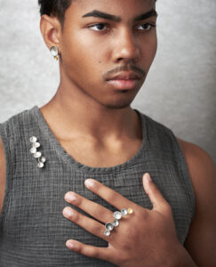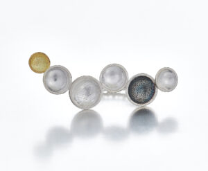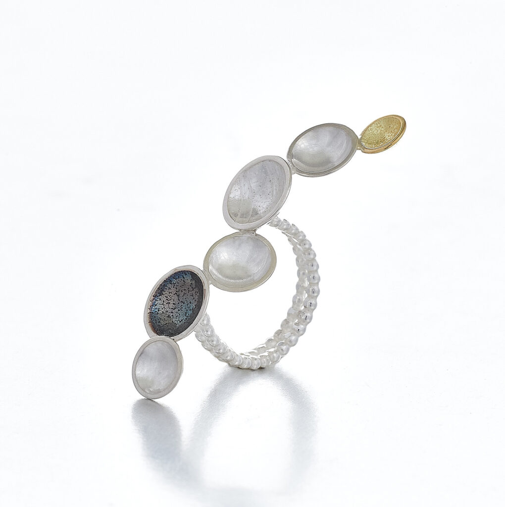 This ring is inspired by playful cloud formations where the smooth and textured silver and gold hemispheres are organically juxtaposed. The band is made from beaded wire and echos the repeated circles.