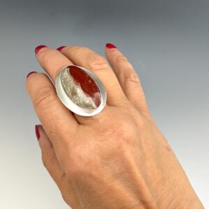 The sterling silver ring has a 15mm (5/8”) wide, rock textured U-shaped band, and will fit a finger that is a size 7.5. The stone is 1.5” long and .75” wide.