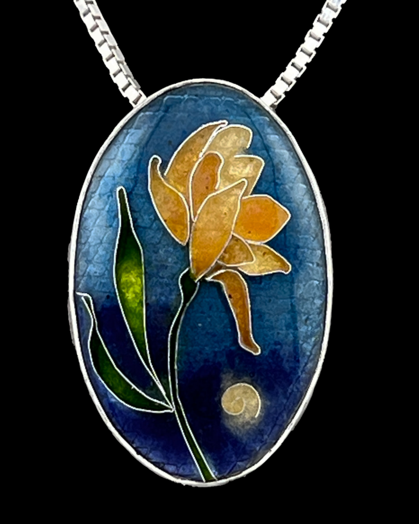 A yellow blossom floating in the sky illustrates the exuberance of spring. Fine silver wires shape the flower and leaves while carefully layered enamel builds a vibrant sky as a backdrop.