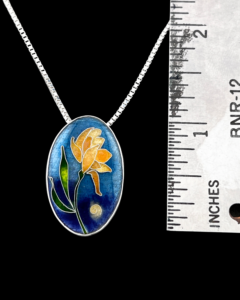 The enamel panel is set in sterling silver with a peek-a-boo hole that shows the back of the enamel which houses a small enameled flower.