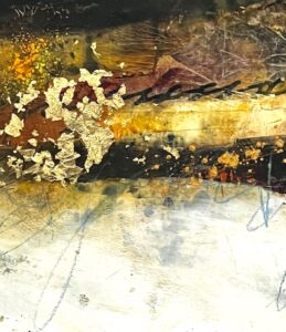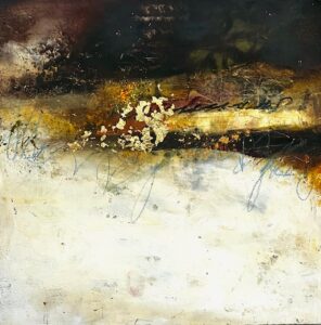 Artist Notes: Layered with oil and cold wax, this work balances open, atmospheric whites with richly textured passages of depth. A luminous band of gold leaf emerges from darker earthen tones, catching the light and creating quiet contrast.