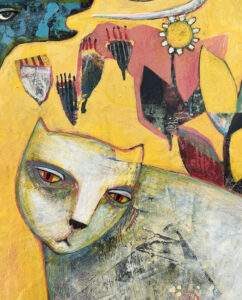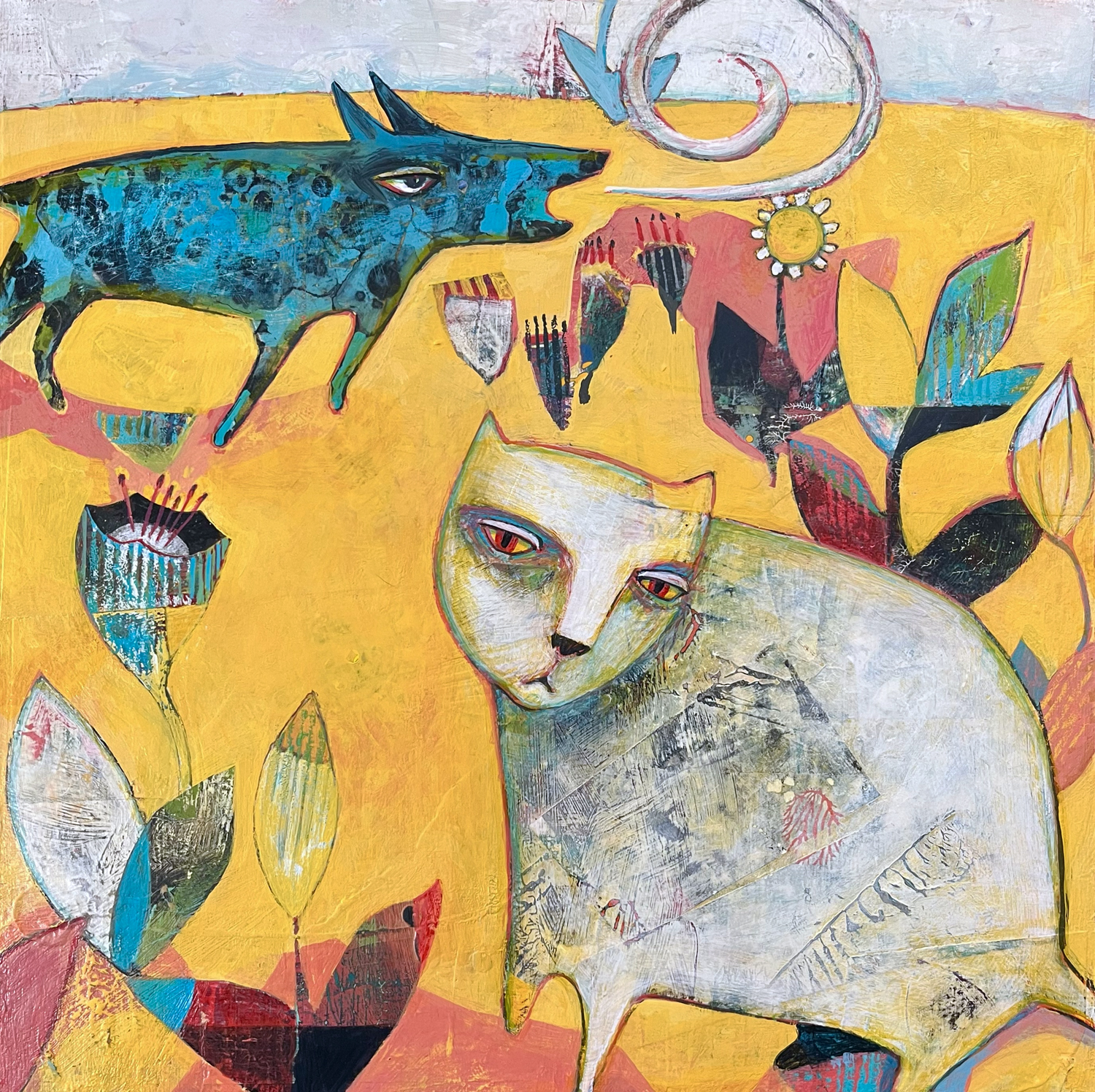 Neighbors is made by building up layers of collage and paint, sanding to reveal layers of color. It is varnished with a matte acrylic medium.
