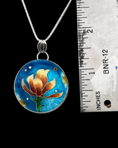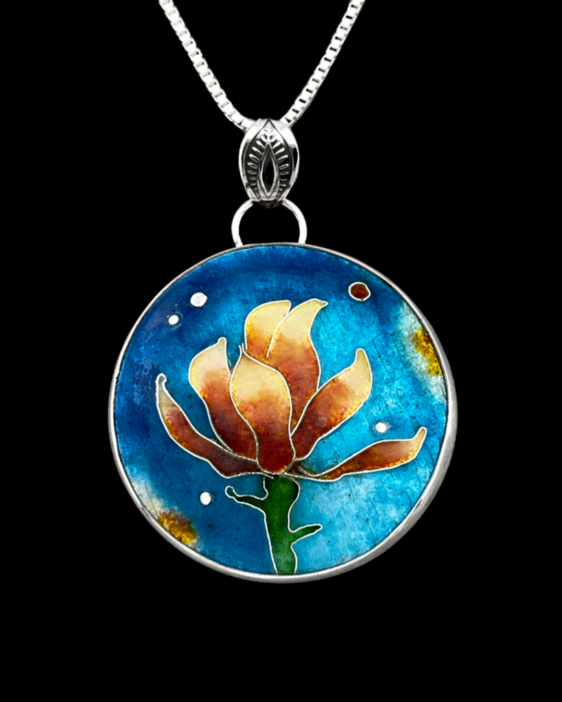 Artist Notes: A yellow and red blossom opens fully toward the sun, expressing warmth, vitality, and the quiet power of becoming. Fine silver wires shape the flower and its leaves, while carefully layered enamel forms a sky of aqua and violet behind it. Soft impressions of surrounding blooms appear as pale washes of yellow and red in the distance, while small silver accents catch the light like morning dew suspended in the air.