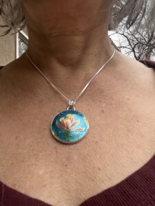 The enamel panel is set in sterling silver with a small peek-through opening on the back, revealing a hidden enameled mandala—an intimate detail that echoes the sense of inner light and expanding energy.