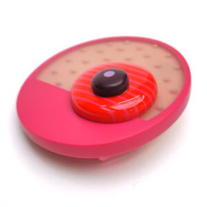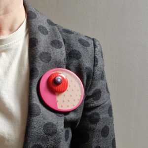 The brooch is finished with a bright cerise pink edge and layered with red polished stripy element, and an extra little maroon round with a lilac spot inlaid.