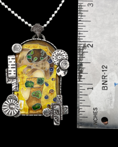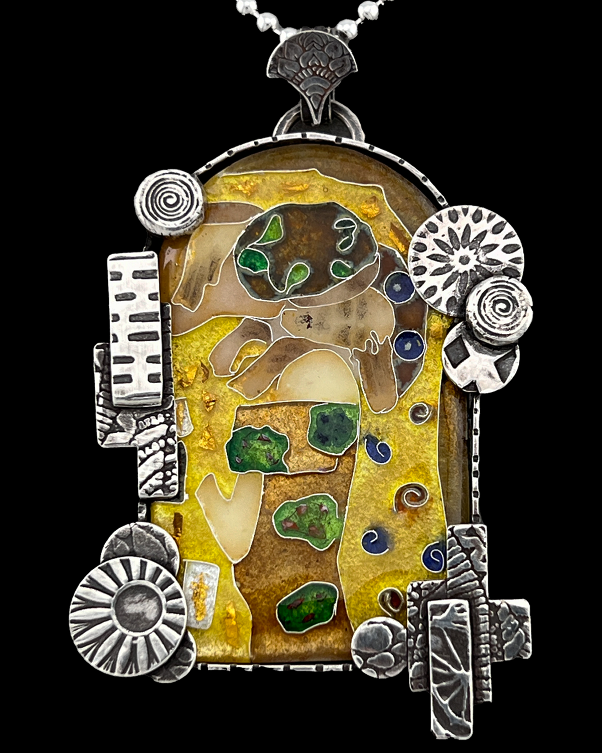 Inspired by the master of passion, pattern, and color, Gustav Klimt, this cloisonné interpretation of The Kiss captures movement and texture through fine silver wires that define each detail. Layers of enamel bring forth the rich, vibrant colors, echoing the depth and emotion of the original work.