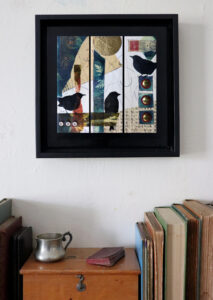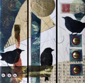Each painting begins with an abstract collage, built from fragments of botanical prints made using plants gathered from my garden. I often incorporate image transfers, leaf imprints, vintage notions, ephemera, and other materials to add depth, texture, and narrative.