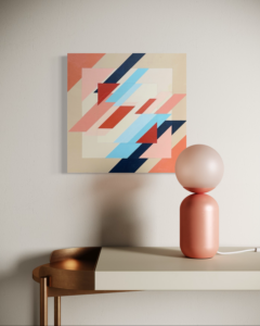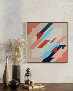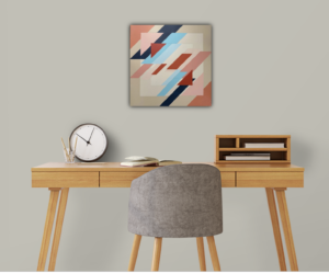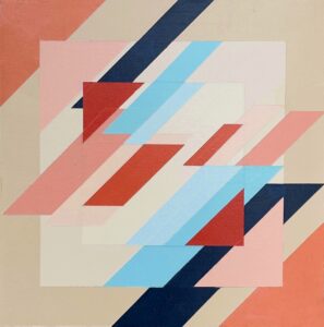 Inspired by a sketch for an original lace design.This hard edge painting is build up in layers. Because of the layers, the finished painting reminds me of waves leaving marks on a tropical sandy beach.