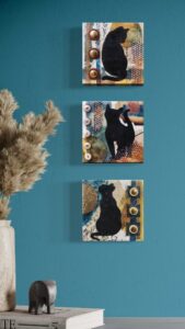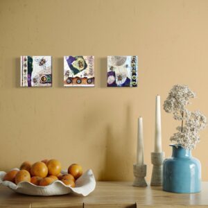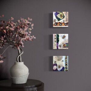Each painting in this triptych measures 5"x5". Wired and ready to hang in any configuration or each can sit solidly on a shelf or nook. They would also make wonderful individual gifts.