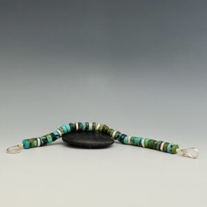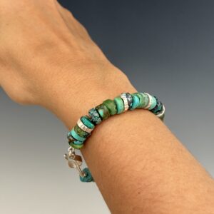 This bracelet is 8" long with a custom made sterling silver clasp. The silver disc beads were cut out of thick silver and the edge was textured with a hammer. The turquoise beads came from my collection - I still love and buy them! I believe the turquoise is Chinese.