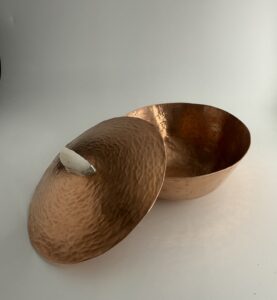 I took a hike a few months ago and found this triangular piece of white quartz up a canyon. Just sitting on the ground, and I instantly thought, “Arrowhead!”. Well, it miiight be, but probably not. It was just a piece of quartz and doesn’t have any real “worked” textures. It does look cool on the lid of this vessel, though. Raised from a flat circle of copper, the bowl is hammered and then planished (smoothed out) with several different hammers. The lid still has the dome-forming hammer marks and a fine silver bezel holding the quartz piece. Several coats of paste wax should keep the bright copper color from darkening. Clean with a soft cloth, and additional coats of wax can be applied as needed.